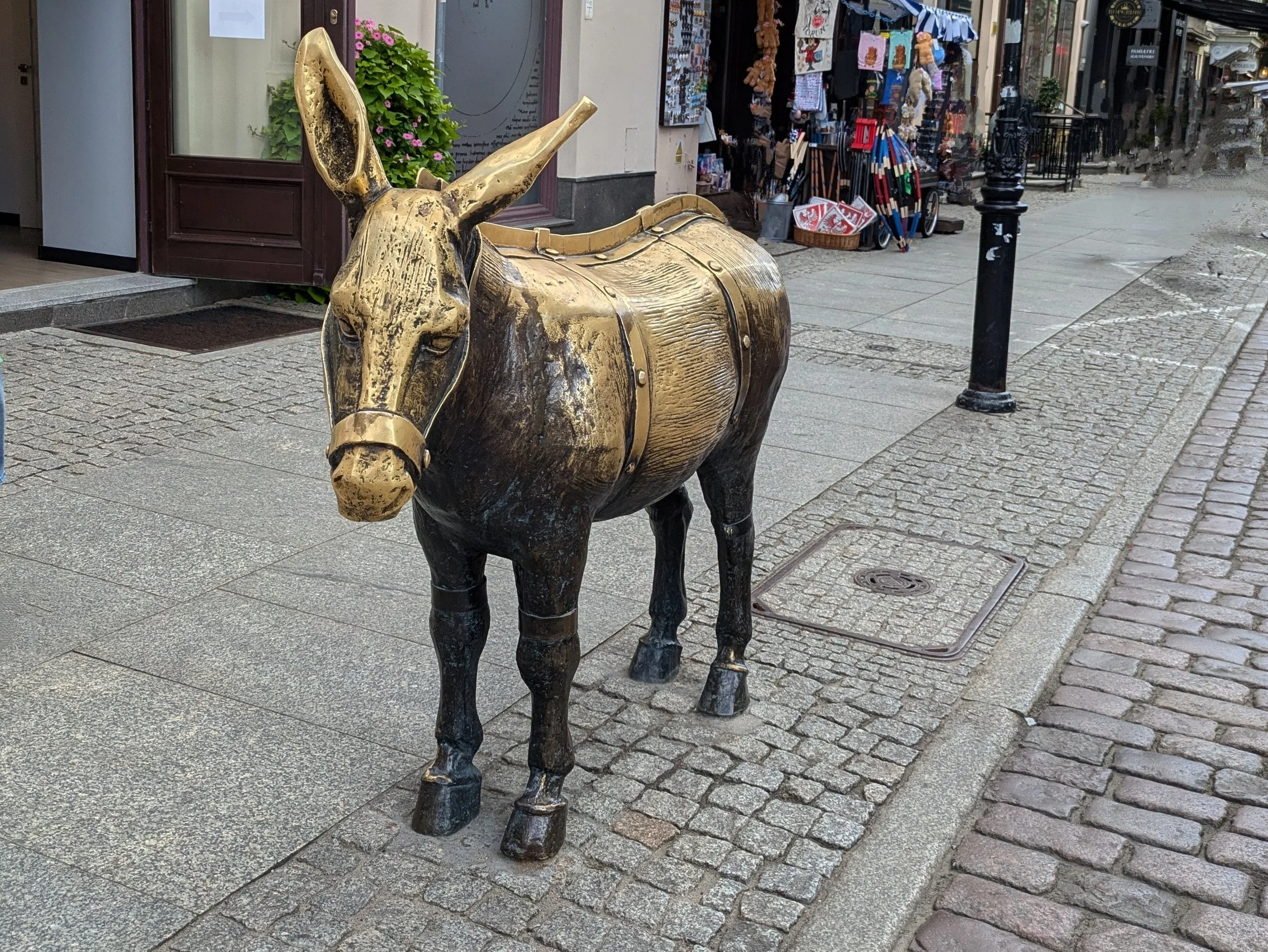 Also, there are a couple of well known statues in the town square. One is a donkey which looks pretty cute and harmless, but was actually used as punishment in medieval times. If someone misbehaved, they had to sit in the town square on the donkey which was equipped with a saddle of spikes!
